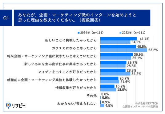 「Q1.あなたが、企画・マーケティング職のインターンを始めようと思った理由を教えてください。(複数回答)」と質問したところ、2024年は「新しいことに挑戦したかったから」が41.4%、「ガクチカになると思ったから」が40.5%、「将来企画・マーケティング職に就きたいと考えていたから」が36.9%という回答となりました。