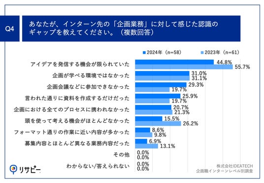 Q3で「非常に感じた」「やや感じた」と回答した方に、「Q4.あなたが、インターン先の「企画業務」に対して感じた認識のギャップを教えてください。(複数回答)」と質問したところ、2024年は「アイデアを発信する機会が限られていた」が44.8%、「企画が学べる環境ではなかった」が31.0%、「企画会議などに参加できなかった」が29.3%という回答となりました。