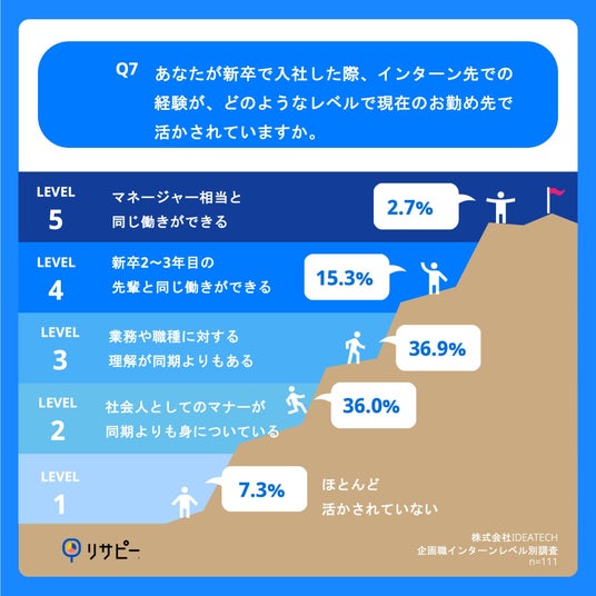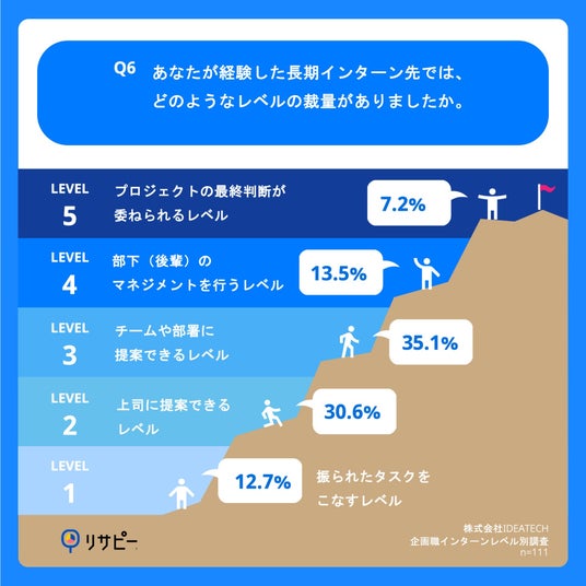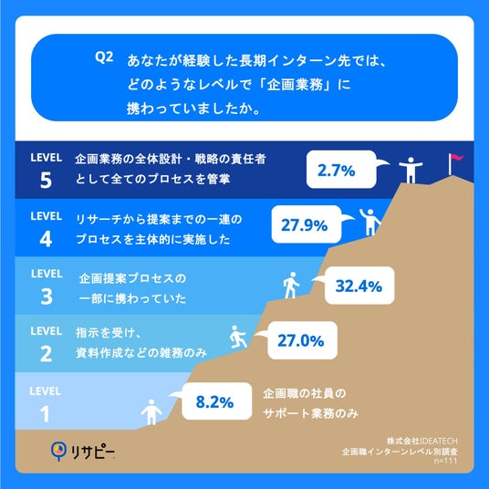 ワンストップでリサーチデータマーケティングを実現する「リサピー(R)️」(https://ideatech.jp/service/research-pr)を運営する株式会社IDEATECH(本社:東京都港区、代表取締役社長:石川友夫)は、学生時代、企画・マーケティング職として長期インターン(半年以上)の参加経験がある会社員111名を対象に、企画職インターンレベル別調査を実施しましたので、お知らせいたします。