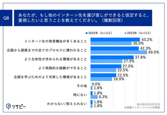 「Q8.あなたが、もし他のインターン先を選び直しができると仮定すると、重視したいと思うことを教えてください。(複数回答)」と質問したところ、2024年は「インターン生の発言機会が多くあること」が43.2%、「企画から提案までの全てのプロセスに携われること」が42.3%、「より主体性が求められる環境があること」が37.8%という回答となりました。