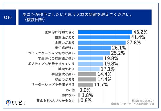 「Q10.あなたが部下にしたいと思う人材の特徴を教えてください。(複数回答)」と質問したところ、「主体的に行動できる」が43.2%、「協調性がある」が41.4%、「企画力がある」が37.8%という回答となりました。