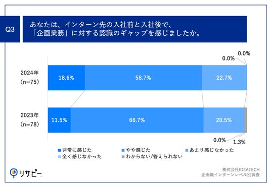 Q2で「レベル1・レベル2・レベル3」と回答した方に、「Q3.あなたは、インターン先の入社前と入社後で、「企画業務」に対する認識のギャップを感じましたか。」と質問したところ、2024年は「非常に感じた」が18.6%、「やや感じた」が58.7%という回答となりました。