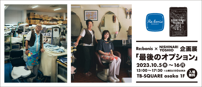 タカラベルモント株式会社(本社:大阪市中央区、代表取締役会長兼社長:吉川 秀隆)は、当社アップサイクルプロジェクト「Re:bonis(リボニス)」と大阪・西成発のファッションブランド「NISHINARI YOSHIO(ニシナリヨシオ)」が初めて協業した企画展「最後のオプション」を10月5日(木)~16日(月)(期間中、土曜日と15(日)は休み)、 TB-SQUARE osakaにて、入場無料で開催いたします。当社では、『人と地球の「らしさ」輝く社会をつくる。』をサステナビリティポリシーに掲げ、SDGs12(つくる責任つかう責任)の推進を目的に、Re:bonisの活動を通じて地域社会へ貢献していきたいという想いから立案しました。また西成は、創業の地であり、当社のものづくりの一大拠点です。「プロフェショナル用椅子」と「洋服」とジャンルを超えて、“ものづくり”に情熱を注ぐ両者が意気投合し、異色のコラボレーションが実現しました。