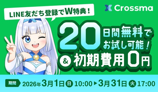 株式会社IZUMI(本社:東京都中央区京橋、代表:藤本卓治)が提供する「クロスマ」は、2026年3月1日(日)より、LINE公式アカウントの友だち登録を条件に、初期費用0円+20日間無料トライアルが受けられる「W特典キャンペーン」を期間限定で実施いたします。