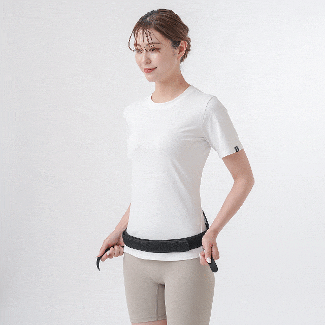 1.ベルトの両端を持って腰の位置に当て、左側のベルトをお腹側で押さえ、右側のベルトを引っ張り、面ファスナーをとめます。