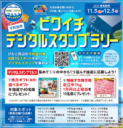 11月3日~9日のビワイチ週間にあわせて、びわ湖周辺の平和堂対象店舗15スポットをめぐって、デジタルスタンプを集める「ビワイチスタンプラリー」を実施します。デジタルスタンプを15個集めると近江牛や滋賀県の選べるギフトなどのプレゼントが当たる抽選に参加できます。