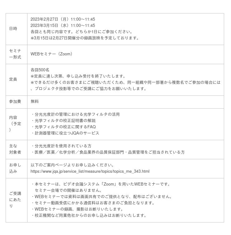 一般財団法人日本品質保証機構(JQA)は、2023年2月27日(月)、3月15日(水)にZoomを用いた無料WEBセミナー「分光光度計の精度管理~校正用光学フィルタの活用方法~」を開催いたします。