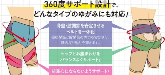 POINT:1 はくだけで骨盤まわりを補正!骨盤のゆがみは様々なタイプがあり、それぞれのゆがみ方に合わせて補正する必要があります。〈骨盤サポートガードル〉なら360度全方向から骨盤まわりを補正。どんなタイプの歪みでも対応できるのです。