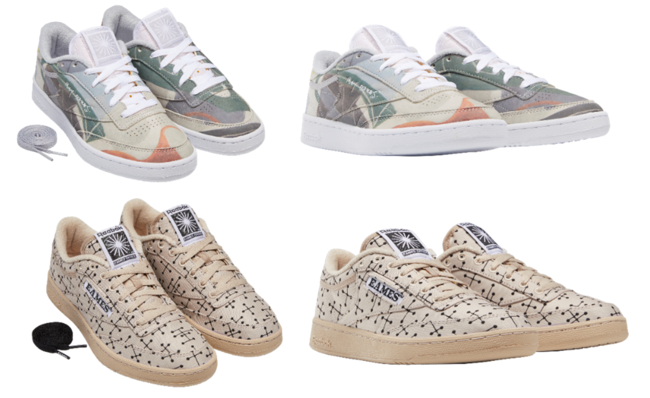 昨年11月に発売された「Club C Monotone Pack(クラブシーモノトーンパック)」に引き続き、今年もリーボックを代表する「CLUB C」とのコラボレーションモデルを発売します。今回はイームズ夫妻が最も愛したテキスタイルプリントや、妻レイ・イームズの最もアイコニックな作品「コンポジション」からインスピレーションを得たデザインの2足が登場します。『EAMES OFFICE』特有の卓越したフォルムや色彩と、リーボックのクラシカルなシルエットが見事に融合した、オリジナリティ溢れるコラボレーションモデルに仕上げました。