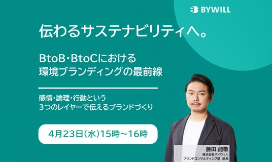 日本のカーボンニュートラル実現を目指し、脱炭素コンサルティング、ブランドコンサルティングやカーボンクレジットの創出・販売を行う株式会社バイウィルは、無料セミナー『伝わるサステナビリティへ。BtoB・BtoCにおける環境ブランディングの最前線』を、2025年4月23日(水)にオンラインにて開催いたします。