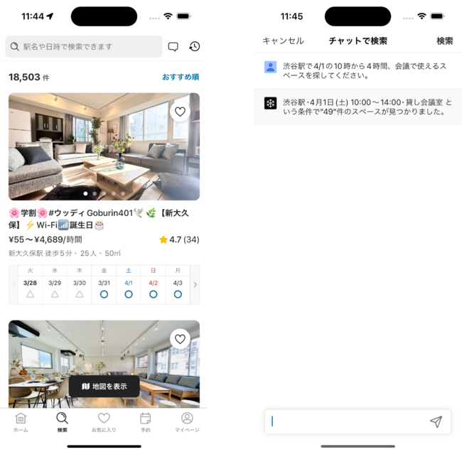 スペースマーケットアプリの右上「吹き出しマーク」より「チャットで検索」を表示し、キーボード入力または音声入力でスペースの希望条件の質問を投げかけることができます。