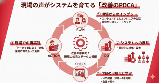 こうして生まれる“現場発の改善”が、CREWSの精度を高めるエンジンとなっています。PDCAサイクルが常に回り続ける中で、CREWSシステムは実際の業務に寄り添いながらアップデートされ、利用する社員たちが「データで楽になる」「AI活用がお客様のためになる」と実感できる文化が社内に根付いています。
