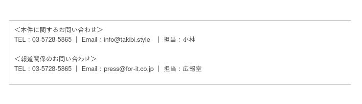 TAKIBIは「アウトドアを通じ地方創生を行い、社会に貢献する」というミッションを掲げ、キャンプやグランピングを中心としたアクティビティ関連情報を発信する『TAKIBI media』や、キャンプ施設に特化した予約サイト『TAKIBI』の運営をおこなっています。TAKIBI media:https://www.takibi-reservation.style/media/TAKIBI(予約サイト):https://www.takibi-reservation.style/※施設運営者の方でご興味ある方は下記をご覧ください。https://www.takibi-reservation.style/serviceintroduction※製品の掲載ご希望の方はこちら:https://www.takibi-reservation.style/media/contact/・TAKIBIのSNSアカウント