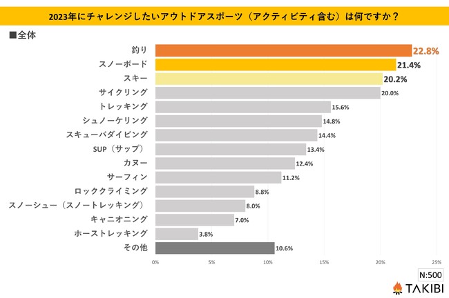 全国の10代~60代の男女を対象とした「2023年にチャレンジしたいアウトドアスポーツ(アクティビティ含む)は何ですか?」というアンケートを行ったところ、最も多かった回答は「釣り」で22.8%という結果になりました。次いで、「スノーボード」が21.4%、「スキー」が20.2%となっております。また、「その他」として「ウォーキング」や「ハイキング」などの回答が得られています。