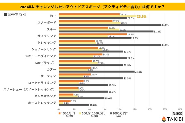 世帯年収別に見ると、「釣り」以外の全ての項目において「世帯年収1,000万円~」の方の回答が多く集まる結果となりました。以前行った「あなたはアウトドアスポーツ(アクティビティを含む)をしていますか?」というアンケート(https://www.takibi-reservation.style/media/fieldreport/chubu/64876/#t1)では、実際にアウトドアスポーツをされている方も世帯年収1,000万円~の方に多いという結果になりました。仕事仲間や友人が楽しんでいる姿を見て影響を受け、今年こそは挑戦したいと思っている方が多いのかもしれません。TAKIBIでは、アウトドアアクティビティを体験できるキャンプ場やグランピング施設なども多く取り扱っております。キャンプをされる際には、併せてアウトドアスポーツ、アクティビティも一緒に楽しんでみるのはいかがでしょうか。新しい趣味として日々を彩るきっかけになるかもしれません。