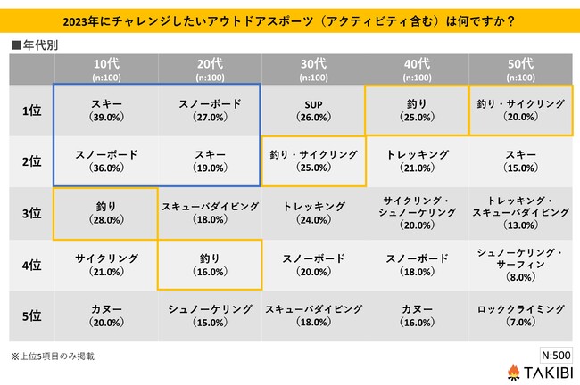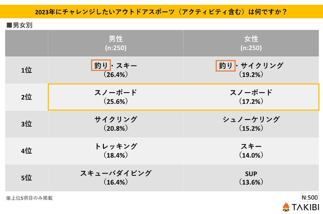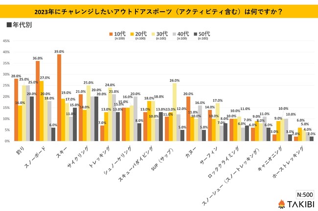 キャンプやグランピングを中心としたアウトドア総合情報サイト「TAKIBI」の運営をおこなう株式会社フォーイットは、全国の10代~50代までの男女500人を対象にチャレンジしたいアウトドアスポーツ・アクティビティに関するアンケートを実施し、男女別・年代別等の特徴についてまとめました。本プレスリリースの転載ではなく、記事内容/グラフ/データなどを引用される際は、必ず下記リンクを出典元としてご記載いただくよう何卒ご協力お願い申し上げます。https://www.takibi-reservation.style/media/questionnaire/103734/(nofollow属性不可)