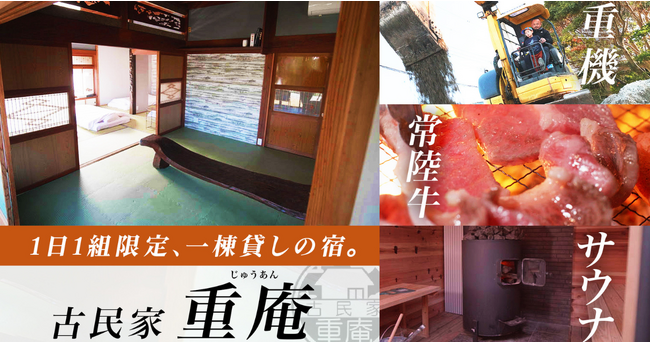 『貸切サウナ・鹿嶋食材BBQ・ド迫力の重機体験! 1日1組限定 一棟貸しの古民家宿「重庵」がオープン』 プライベートサウナ・地産食材のBBQ&ビール・迫力満点の重機体験… 古民家「重庵」で過ごす特別な時間で日々の疲れをリフレッシュ。