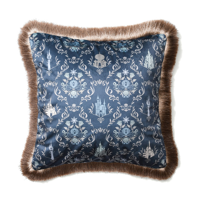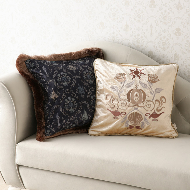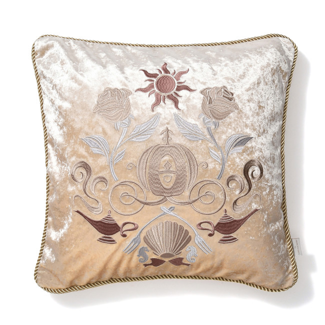 5人のプリンセスモチーフを集合させたオリジナルエンブレムを刺繍したクッションカバーです。光沢のある生地にゴールドトーンの刺繍を施し、周囲をロープで囲んだクラシカルで上品なデザインです。落ち着いた雰囲気でインテリアに取り入れやすいアイテムです。