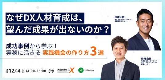 DXによる産業構造変革を推進する株式会社INDUSTRIAL-X(本社:東京都港区、代表取締役CEO:八子 知礼)と、累計40社8,000名の越境学習支援に取り組んできた株式会社エンファクトリー(東京都千代田区、代表取締役:加藤健太)がより効果的なDX人材の提供を目指し業務提携を行うことをお知らせします。また、サービスの提供開始に伴い、DX人材育成をテーマとした「なぜDX人材育成は、望んだ成果が出ないのか?成功事例から学ぶ、実務に活きる「実践機会」の作り方3選」ウェビナーを開催します。