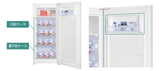 5段収納の最上段は仕切り棚で奥行が30cmあり、長さのある冷凍食品や作り置きを保存している容器などを収納できます。中3段は中が見やすいクリアカラーのケースで、引き出し式となっている為、収納した食品が取り出しやすくなっております。最下段のケースは大型で高さが約23cmある為、箱型のアイスのようなかさばる食品を保管することができます。扉にはドアポケットも配備されているので、アイスキャンディーや保冷剤など、厚みがなくすぐに取り出したいものの保管に便利な作りとなっております。