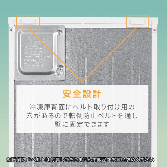 背面には、市販の転倒防止ベルトを取り付ける為の⽳があり、これによって冷凍庫を壁に固定することができ、災害時の転倒を防止することができます。