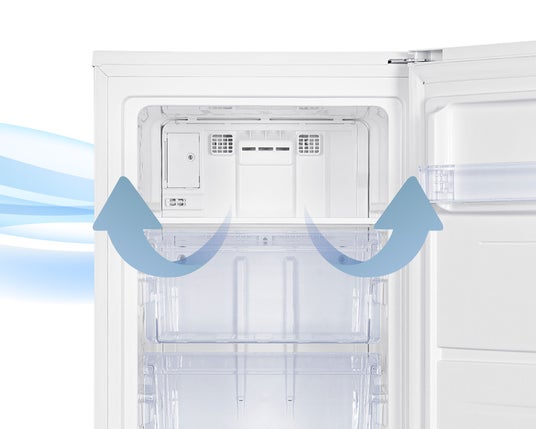 庫内には、ファンで冷気を全体にムラなく広げることにより自動で霜取りを行うファン式自動霜取りを設置しておりますので霜が付きにくく、庫内のお手入れを簡単にすることができます。