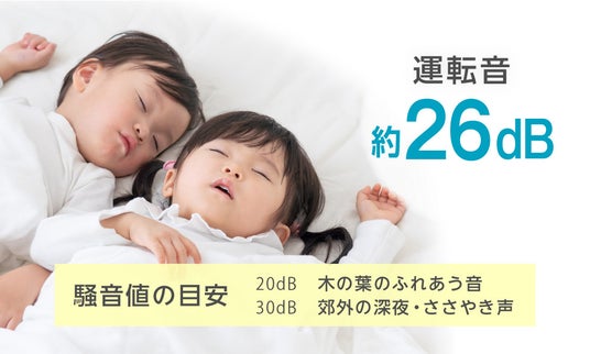 運転音は約26db程度でとても静かです。一人暮らしの方のお部屋や個室などの限られた空間、赤ちゃんや小さなお子様がいらっしゃるご家庭でも安心してお使いいただけます。