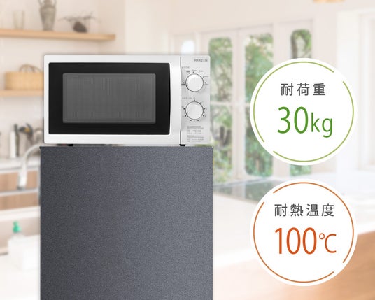 天板は耐熱温度100℃、耐荷重30kgの耐久性を誇り、電子レンジをすっきり収納することができます。