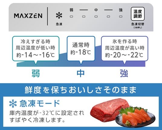 操作パネルでは庫内温度の調節や急凍モードへの切り替えができます。温度は弱・中・強の三段階で、食品が冷えすぎたとき、氷を作るとき、周辺温度が変わったときなど、シチュエーションに合わせて調整いただけます。・急凍モードに設定すると庫内温度が-32℃に設定され、食品の鮮度を保つために素早く冷凍します。