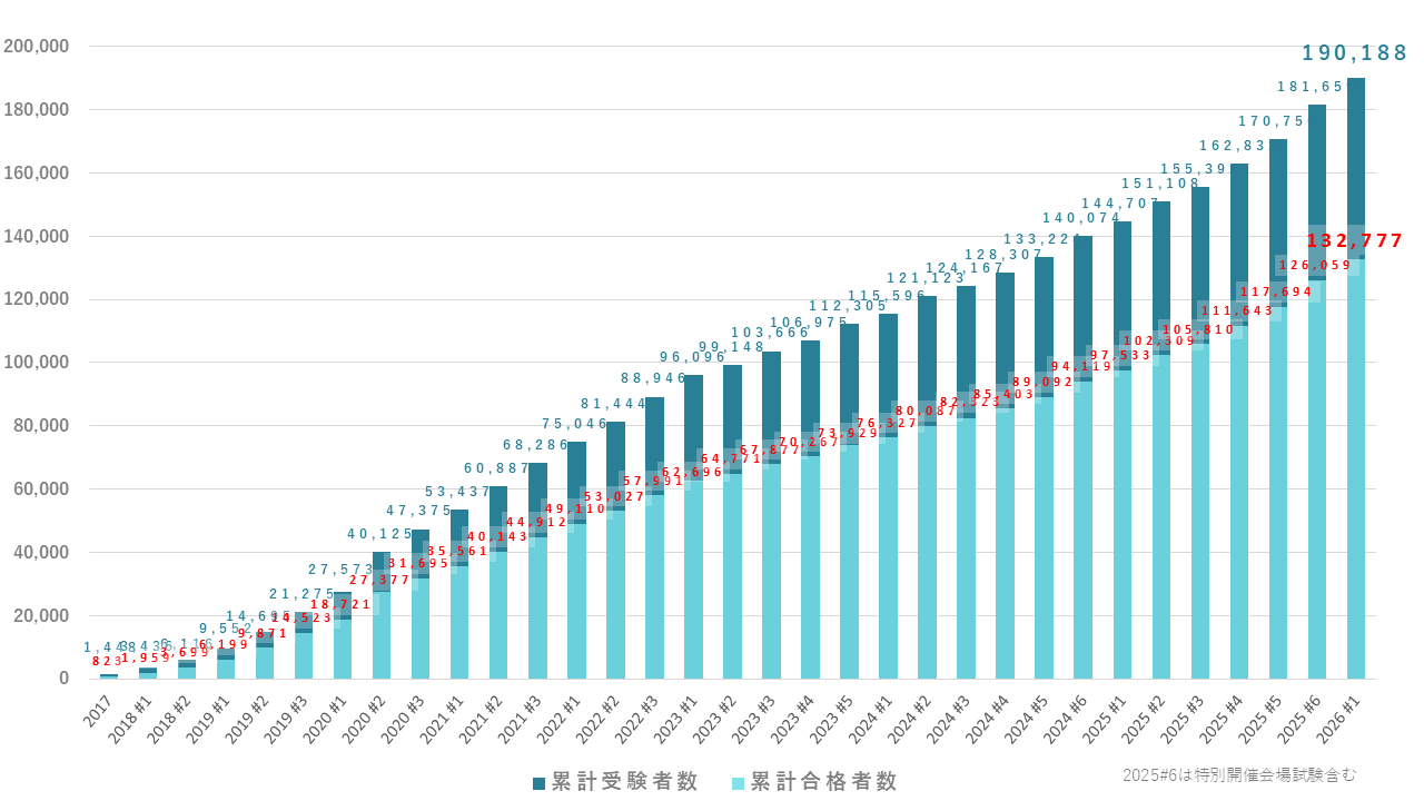 これにより、G検定の累計受験者数は190,188名、累計合格者数は132,777名になりました。