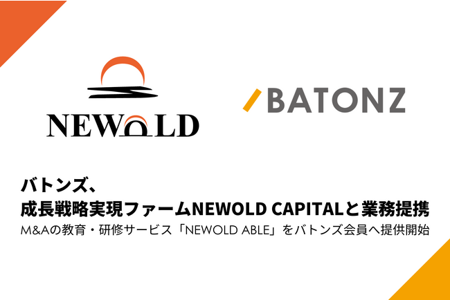 M&A総合支援プラットフォーム「BATONZ(バトンズ)」を運営する株式会社バトンズ(本社:東京都中央区、代表取締役CEO:神瀬悠一、以下バトンズ)は、成長戦略実現ファームとして、M&A仲介支援や経営人材紹介、M&Aの教育・研修サービスを展開する株式会社NEWOLD CAPITAL(本社:東京都渋谷区、代表取締役CEO:栗原弘行、以下「NEWOLD」)との業務提携をお知らせします。