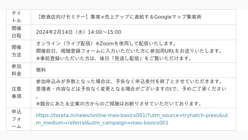 株式会社ベクトル(本社:東京都港区、代表取締役会長兼社長:西江 肇司、東証プライム:6058)の子会社である株式会社トライハッチ(東京都新宿区、代表取締役社長、武藤 尭行、以下、トライハッチ)は、株式会社トレタ(東京都渋谷区、代表取締役 CEO:中村 仁、以下、トレタ)と共同で、無料オンラインセミナー「【飲食店向けセミナー】集客×売上アップに直結するGoogleマップ集客術」を2024年2月14日(水)14:00より開催いたします。