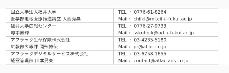 国立大学法人福井大学(学長:上田 孝典)、アフラック生命保険株式会社(代表取締役社長:古出 眞敏)、アフラックデジタルサービス株式会社(代表取締役社長:二見 通)の3者は、福井県内の高齢者の健康増進を目的とした共同研究契約を10月17日に締結しました。