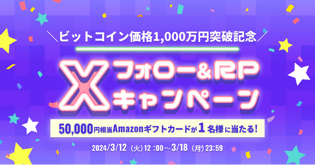 ビットトレード株式会社(所在地:東京都港区、代表取締役社長:関 磊、以下「ビットトレード」)は、3月12日(火)より、ビットコイン価格1,000万円突破記念!フォロー&RPキャンペーンを開催いたします。