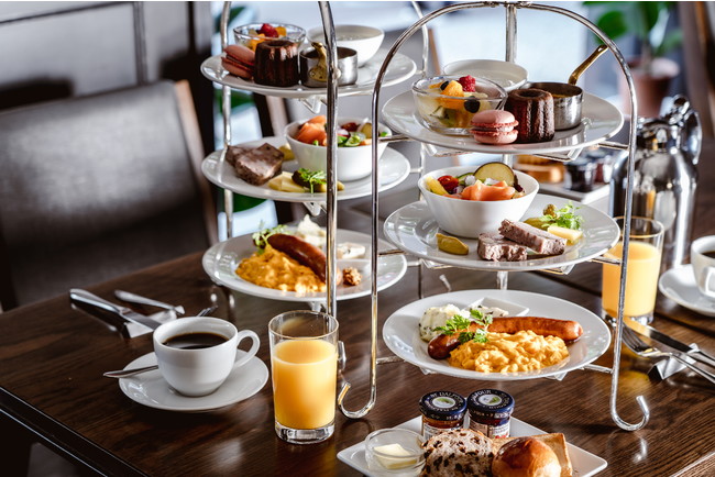 ホテル1階レストラン「ルボンヴィーヴル」にて、前菜からメイン、デザートまでを、3段のティースタンドで提供するモーニングハイティーが誕生しました。レストランオリジナルレシピのパテ・ド・カンパーニュやトリュフ入りマッシュポテト、京都に本店を構える「一保堂茶舗」のほうじ茶を用いたクレームブリュレなど10種類以上のメニューを、ベーカリー「進々堂」のパンと共に、ハイティースタイルで、一度に楽しめる新しいメニューです。彩りあざやかでバラエティー豊かな料理の数々が楽しめる、いつもとは異なる朝食スタイルで、優雅な時間をお過ごしください。