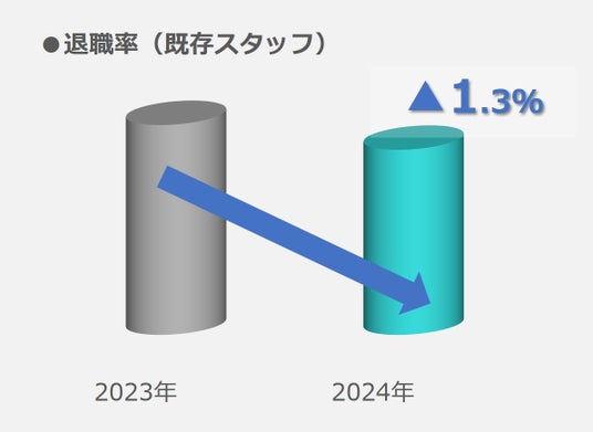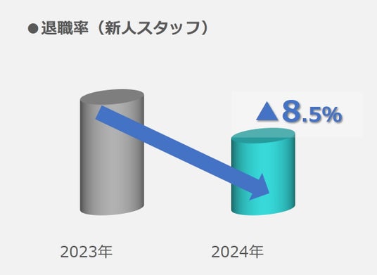 また、既存スタッフにも変化がありました。2023年と比較すると2024年の退職率は1.3%減少しました。美容師は入社後半年以内に退職してしまうケースが多い中、2024年の新入社員は前年より8.5%減と大幅に改善しました。