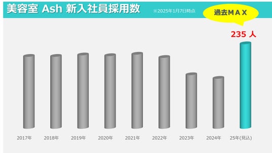 美容室チェーンを約350店舗展開する株式会社アルテジェネシス(横浜市中区/代表取締役社長 吉村 栄義)のグループ会社である株式会社アッシュ(横浜市中区/代表取締役社長 柴崎 興司)は、2025年内定者数が235名(※1)を超え、Ash設立以来(※2)過去最高となっていることを発表いたします。