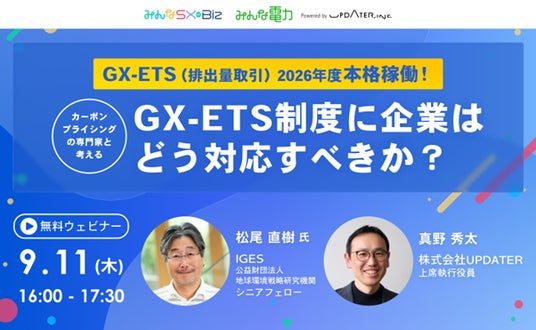 社会課題をオモシロく解決する企業、株式会社UPDATER(所在地:東京都世田谷区、代表取締役:大石英司)は、2026年度から本格始動するGX-ETS(排出量取引制度)への企業対応をテーマとしたウェビナーを、サステナビリティ経営を支援するプラットフォーム「みんなSX for Biz」にて、2025年9月11日(木)16:00~17:30に開催します。