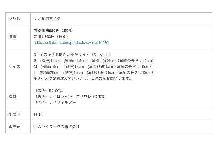 サムライワークス株式会社(代表取締役社長:新島 実 本社所在地:東京都渋谷区)は、感染防止と経済の両立に向け、医療用レベルで飛沫防止ができるフィルターを使用した『ナノ抗菌マスク』を好評につき、特別価格の1枚980円(税別)で緊急追加販売を開始します。