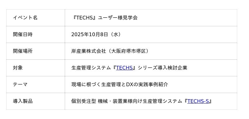 今回のレポートでは、岸産業株式会社様(大阪府堺市堺区)での開催の様子を取り上げ、生産管理システムの導入背景や運用のノウハウ、現場での活用ポイントなど、DXを現場に根づかせるための実践例をご紹介しています。