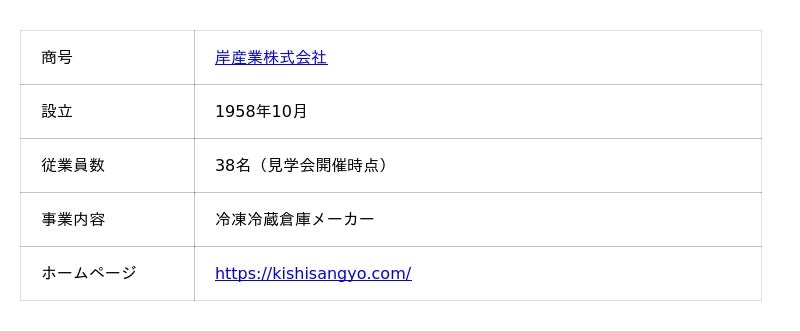 本見学会では、岸産業株式会社様の代表取締役と取締役工場長が登壇し、以下の内容が共有されました。