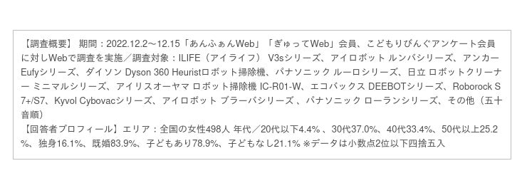園児とママ・パパの情報誌「あんふぁん」「ぎゅって」を発行する株式会社こどもりびんぐ(所在地:東京都千代田区、代表取締役:中島一弘)は、「シルミル研究所」としてリサーチ事業を展開しています。「シルミル研究所」では、女性を対象にした調査「ウーマンリサーチ」を実施し、女性が選ぶおすすめの商品やサービスをランキング形式で、Webコンテンツとして発信しています。今回は2022年12月に実施した「ロボット掃除機」についての調査結果を発表します。
