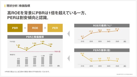 ROEは、想定する株主資本コスト(約8%)※を上回っており、エクイティスプレッドも高水準で推移しています。こうした高いROEを背景に、PBRは1倍を超えている一方で、PERは割安な水準にあると認識しています。