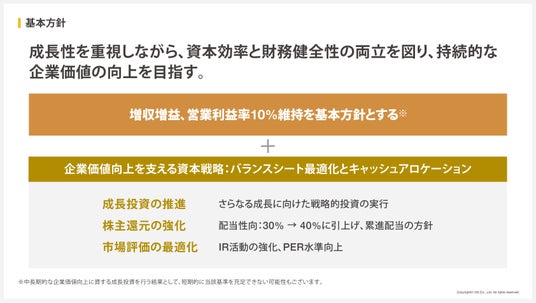当社は、成長性・資本効率・財務健全性のバランスを重視し、持続的な企業価値の向上を目指しています。成長性に関しては、増収増益と営業利益率10%の維持を基本方針(※)としております。さらに、バランスシートの最適化とキャッシュアロケーションを軸に、以下の取り組みを推進します。