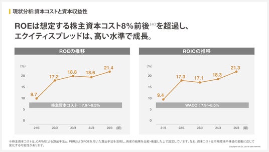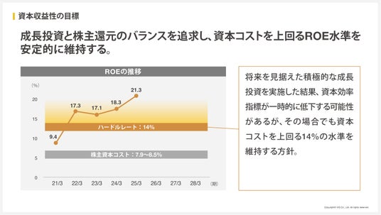 成長投資と株主還元のバランスを追求し、資本コストを上回るROE水準の安定的な維持を目指しています。将来を見据えた積極的な成長投資により、資本効率指標が一時的に低下する可能性はあるものの、ROEのハードルレートを14%に設定し、資本コスト(約8%)を上回る水準を堅持することを基本方針としています。