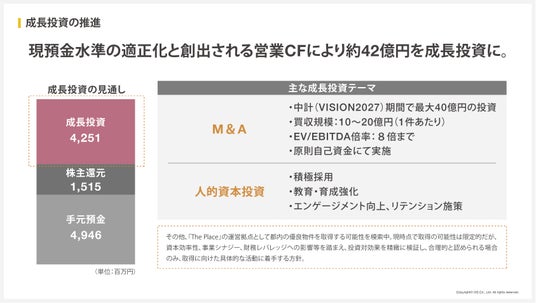 その他、「The Place」の運営拠点として都内の優良物件を取得する可能性を模索しています。現時点で取得の可能性は限定的ですが、資本効率性、事業シナジー、財務レバレッジへの影響等を踏まえ、投資対効果を精緻に検証し、合理的と認められる場合のみ、取得に向けた具体的な活動に着手する方針です。