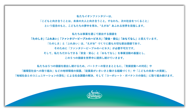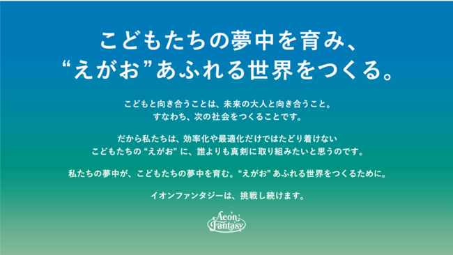 「こどもと向き合うことは、未来の大人と向き合うこと。すなわち、次の社会をつくること」という、未来の社会に対する私たちの責任を「パーパス」に込めました。この「パーパス」の実現に向け、すべてのファンタジーピープルが、こどもたちの“えがお”のために「夢中」になれるイオンファンタジーを目指します。