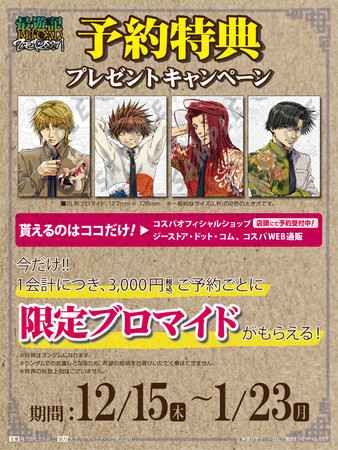 対象の店舗・通販(コスパオフィシャルショップ、コスパWEB通販、ジーストア・ドット・コム)で、1会計につき対象商品を合計3,000円(税込)ご予約ごとに限定特典『通常よりも大きい2L判ブロマイド』を1枚プレゼント。期間中にぜひ手に入れてくださいね!