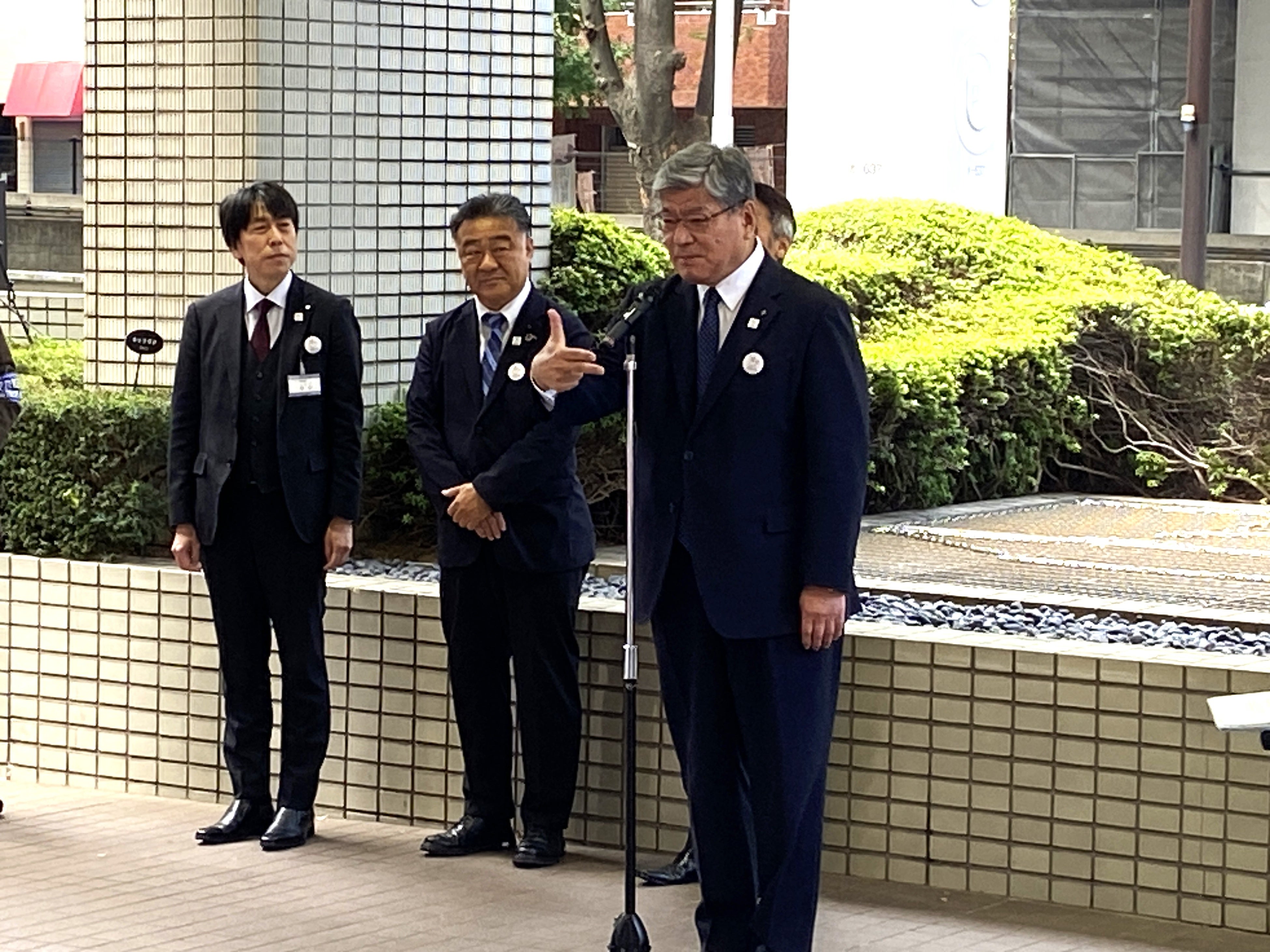 坂本健(さかもと・たけし)板橋区長は、手話で自己紹介後、東京2025デフリンピックの意義・開催概要や、デフリンピックの招致と運営のサポートに取り組まれた、東京都聴覚障害者連盟と板橋区聴覚障害者協会の皆様へ謝意を示しました。そして、選手たちに向けて「出場される選手の皆様のご活躍を、心よりお祈りしております。」と激励の言葉を送り、東京都聴覚障害者連盟の越智大輔(おち・だいすけ)事務局長は「板橋区より東京都に働きかけていただいたおかげで、東京にデフリンピックを招致することができました。また、応援のサインエールを作りました。ぜひ会場に足を運んでいただき、応援をしてください。」と手話で笑顔を見せ呼びかけました。出迎えに集まった方々も、両手の手のひらを高く上げて手話の"拍手"を送り、大会開催の喜びを分かち合いました。