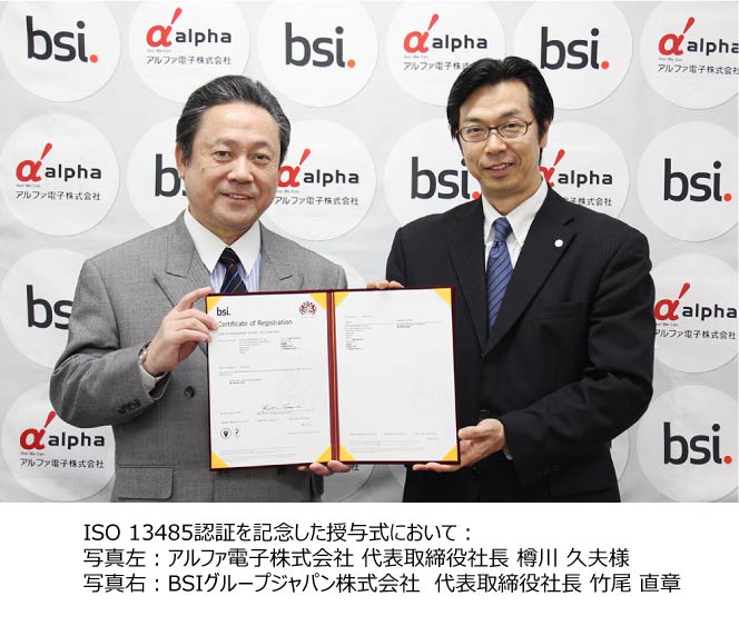 BSIグループジャパン株式会社(東京都港区 代表取締役社長 竹尾 直章、以下BSIジャパン)は、アルファ電子株式会社(福島県岩瀬郡 代表取締役社長 樽川 久夫)へISO 13485(医療機器品質マネジメントシステム)の認証を実施しました。 (認証登録日:2014年12月25日)